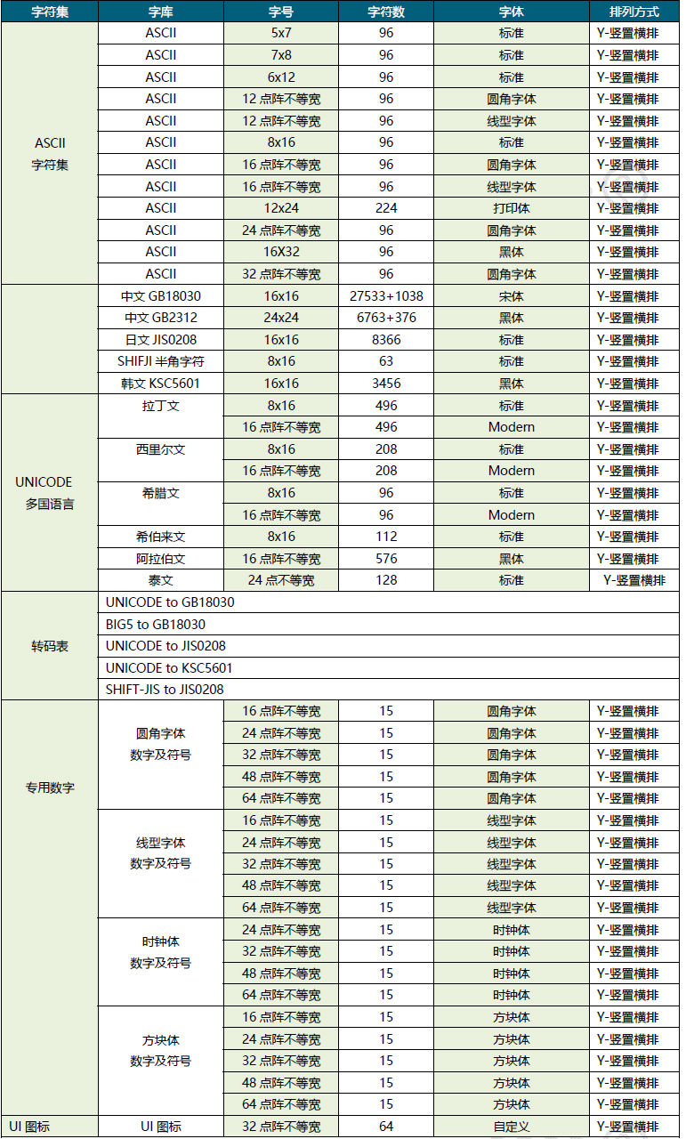 - 点阵排列方式:竖置横排