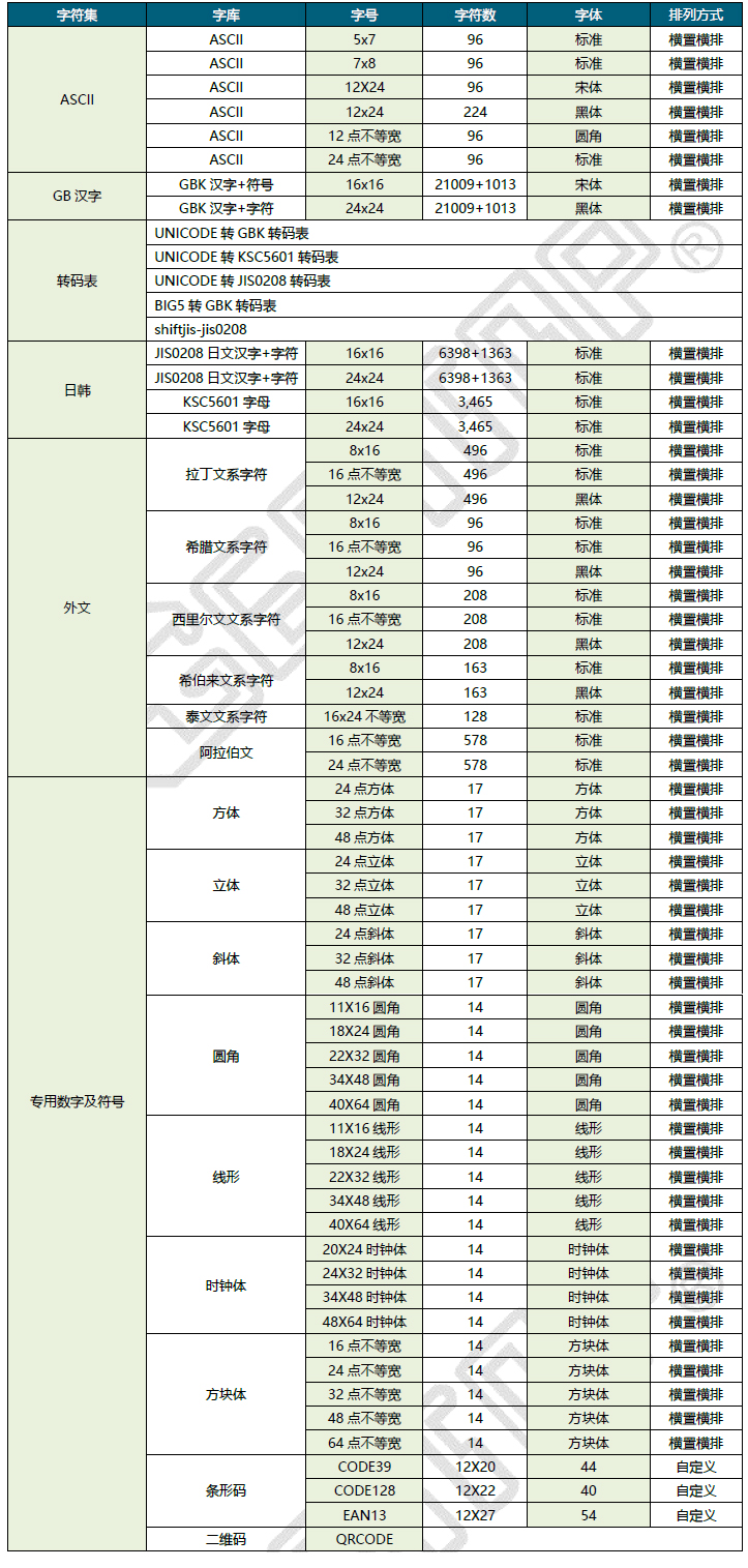 - 字符集:GBK 中文、KSC5601韩文、JIS0208日文、180国外文,支持中、日、韩及多国的Unicode