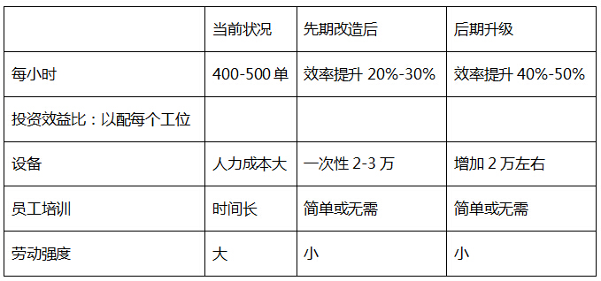 | 预计每个工位:600-700/小时(单)无需熟练工作人员操作,特别是在6,18和双十一等时段高峰期大量无经验的操作人员的进场,也能达到熟练工作人员的速度,无需培训时间。 |