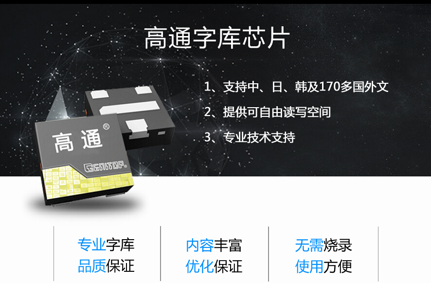 高通字库芯片支持国标GB18030标准字库,包含27484个简繁体汉字兼容UNICODE,并内置日文、韩文、法文、西班牙文、德文和阿拉伯文等170多国语言,功能强大,字型专业美观;芯片内置64K可写空间用于厂商LOGO以及图片的存储。高通高品质专业字库芯片可以广泛的应用于物联网设备、通讯设备、电子烟、智能锁、智能手环、智能手表等一系列领域。 |