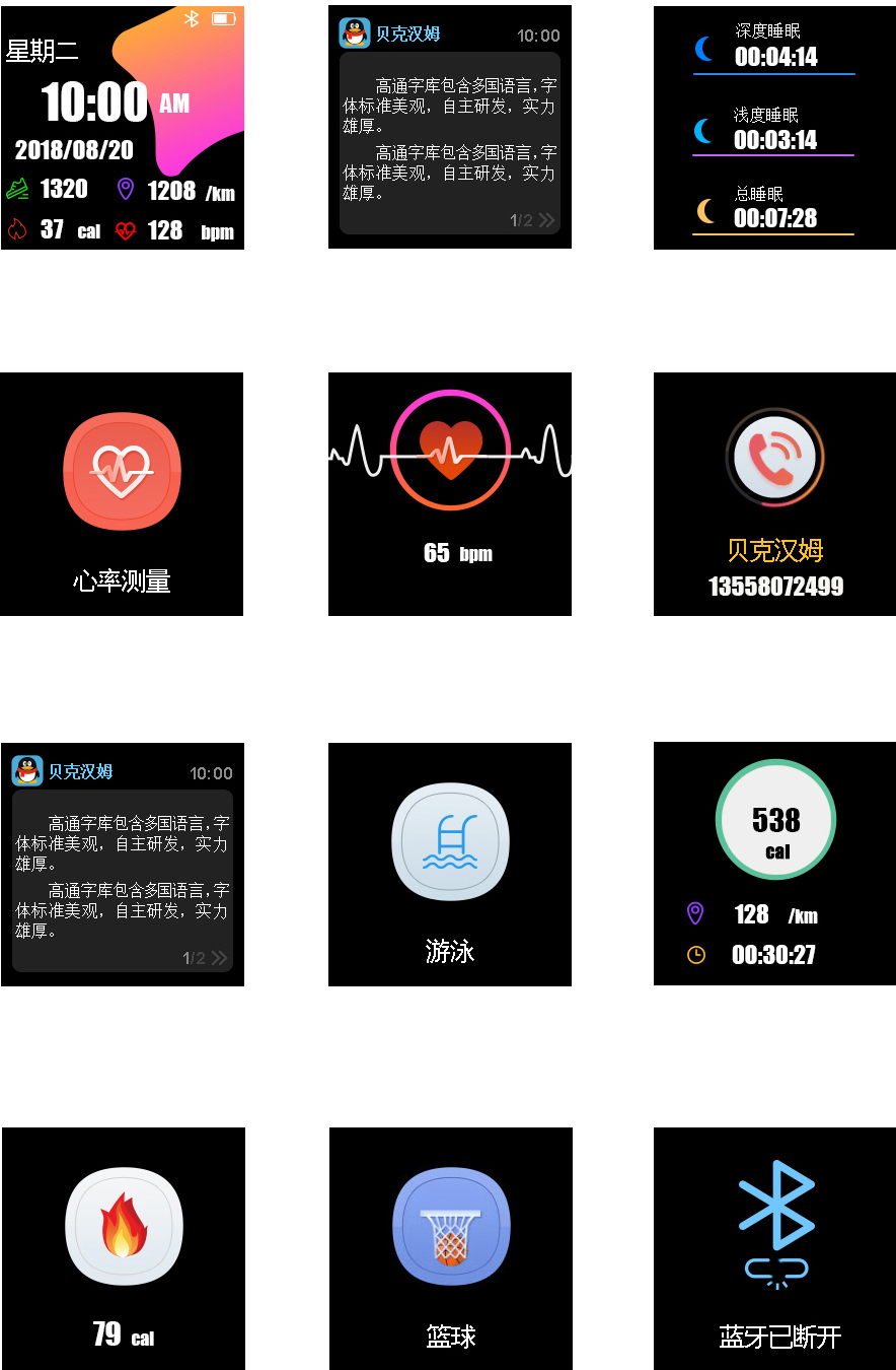 高通240X240方屏智能手表UI显示方案支持国标gb18030标准字库,包含27484个简繁体汉字,兼容UNICODE,并内置日文、韩文、法文、德文西班牙文和阿拉伯文等170多国语言字库,功能强大,字型专业美观,可以