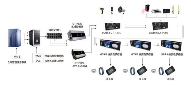 | 同时可以接入外围设备,如穿戴手环、红外感应、RFID读卡器、电子秤、光栅、光幕等设备,以辅助各种不同的流程需求。等于电子标签赋予了货位主动提示,信息反馈和现场操作的能力。 |