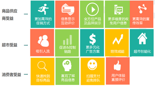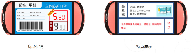 | 当电子货位标签安装在超市货架,无人零售货架时,可以实时显示货位内容和价格,并可以通过亮灯吸引用户到指定货位,从而达到促销,清理库存,控制销路等作用。与此同时,标签显示屏上可以显示产品特点、用户评价、销量、短视频广告播放等等,与系统数据交互,实现线上线下零售的结合,提升用户的体验。商家可通过电子货位标签的亮灯促销和内容显示收取广告费,此方案对消费者、商超和供货商都提供了新维度的便利,通过硬件结合互联网数据,降低了物与物,人与物的信息不对称。 |
