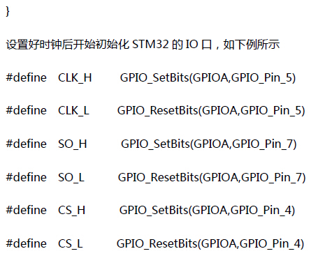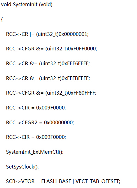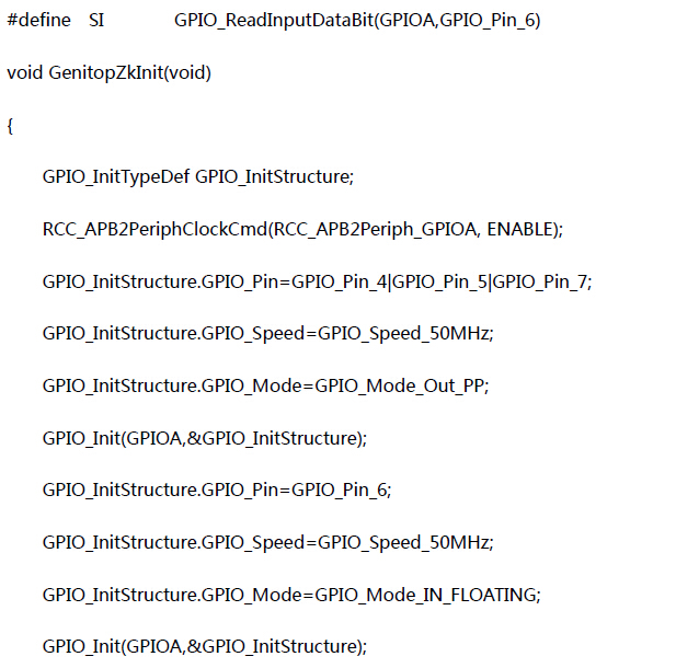 | 本例中使用的单片机型号是STM32F103VDT6,字库使用的引脚是PA口的4,5,6,7脚,首先我们对这个单片机的系统时钟进行设置。进行系统时钟设置后才能开启端口的时钟。具体如下例所示。 |