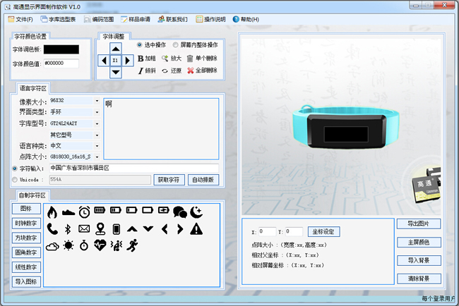 高通显示界面制作软件 V1.0 是我司为客户提前预览字库内容,便于选型而推出的一款免费使用软件,该软件结合了全系列字库芯片型号内容并添加了多种字体效果操作,用户可自定义选择字库型号,设置语言类型、点阵大小等参数获取到对应的字库文字,软件同时还将文字及图标设置为可拖动控件,便于用户自由排版编辑;在UI编辑过程未完成状态下亦可通过文件保存功能将当前UI编辑未完成状态保存,便于下次打开继续编辑,避免重复操作;UI编辑完成后用户可以导出为图片形式保存在当地,也可以将UI界面导入到实际产品屏幕上进行显示评估,在前期产品开发上为客户提供很大的便利。