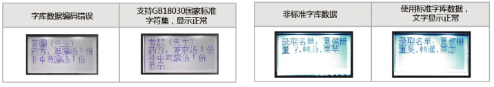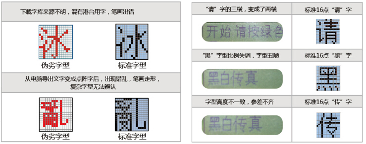 | 使用非正常渠道的字库数据,编码不全,出现错字、漏字现象,严重影响消费者的正常使用,也降低了厂家的产品品质。使用了错误或不标准的字库编码,严重影响中文信息的读取,文字信息乱码直接导致无法正常读取信息,影响了消费者的正常使用。 |