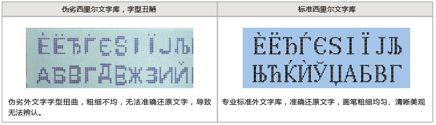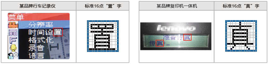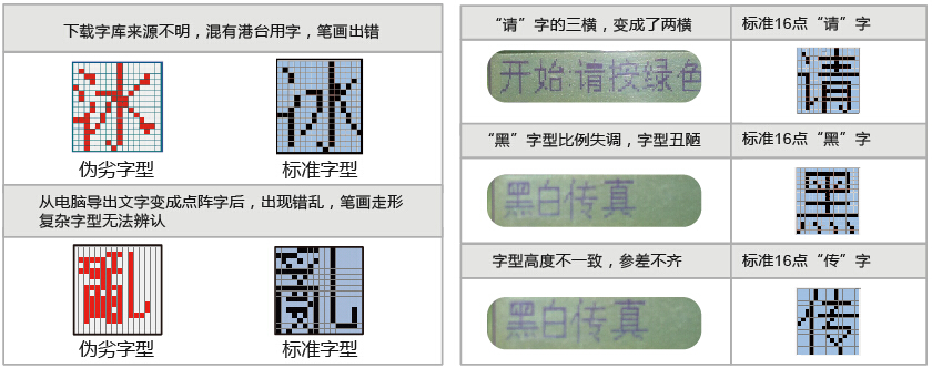 中文字体结构出错,严重影响正常阅读,私自制造字库字模数据,出现少笔画、多笔画字体变形等现象粗糙、丑陋的文字字型,严重影响了厂家的产品品质。 |